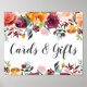 Letreiro de pôster de casamento elegante para exibir na mesa de cartões e presentes. O design apresenta uma moldura de aquarela floral de verão e outono rústica de belas rosas, dálias, flores de peônia e folhagens, em uma paleta de outono deslumbrante de vermelho burgundy, amarelo dourado, laranja pêssego, rosa rosado e tons de verde.