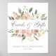 Um buquê elegante de cor d'água, penteados cor-de-rosa pincelados e rosas de creme de marfim enquadra este Cartões e presentes poster de casamento. As manchas botânicas de eucalipto verde-sábio saem decoradas em meio ao conjunto de flores de pêssego que rodeiam a bela e chic script lembrando aos hóspedes que deixassem seu cartão ou presente na mesa.