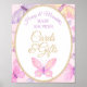 Placas de chá de fraldas e sinal de presentes, cor-de-água branca, rosa e borboleta púrpura. Apresenta texto falho dourado brilhante. Perfeito para chá de fraldas ou festa de aniversário de uma garota. Veja a página do meu compro para pratos, guardanapos, convites, cartões de agradecimento, etc.