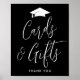 Sinal de festa de formatura moderno com ilustração de um boné de formatura branco no topo com "Cartões e presentes" exibido em um script de caligrafia branca em um fundo preto (ou cor de sua escolha). Personalize o poster de graduação em preto-e-branco com seu texto personalizado na parte inferior (mostrado atualmente com "Obrigado"). O sinal de festa de formatura é perfeito para formandos segundos graus e universitários.