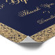 Um design antigo para um elegante cartão de casamento com cores de casamento azul-marinho e dourado. O fundo é azul-marinho. Possui bordas douradas florais com decorações intricadas de rosas selvagens. Todo o texto - "Cartões e Presentes", "Obrigado" e os nomes - está escrito em uma elegante caligrafia. Acima dos nomes há um pequeno coração dourado.