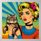 Arte em quadrinhos de arte retrô feita com uma mulher víbora do meio século segurando um gato fofo. Arte aérea brilhante e colorida.