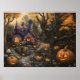 Descubra uma ilustração encantadora que apresenta uma casa fofa e assustadora aninada num manto de abóbora de Halloween. Esta design esbranquiçada apresenta uma casa deliciosa com janelas brilhantes e um cheio de abóboras lúdicas em uma floresta assustadora. Perfeito para o Halloween.