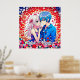 Casal de anime bonito rodeado por flores coloridas. As cores utilizadas são vermelho, branco e azul, principalmente com um pouco de roxo e rosa. . Fofo para Dia de os namorados ou aniversário ou qualquer ocasião romântica.