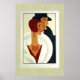 Uma mulher de chapéu vermelho, vestido vermelho, roubos de pele branca, e belas joias de ornamentado, se posiciona com seu bonito companheiro de cavalheiro vestido com chapéu de Homburg e casaco excessivo, faz um casal elegante nesta ilustração assinada em Art Deco do 1920. Um presente perfeito e lembranças para o amante da arte safena! (Artista desconhecido).