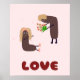 Casal engraçado com flores e texto LOVE em fundo rosa