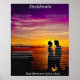 O cheio Desiderata de Max Ehrmann: Siga placidamente em meio ao barulho e à pressa. É uma foto de uma bela foto de uma silhueta de um jovem casal apaixonado em pé perto da margem do mar com a bela luz azul roxa e laranja e amarela do céu. O cheio Desiderata é um poema popular O amado poema escrito por Max Ehrmann em 1872-194 5 é ilustrado lindamente com as cores brilhantes que refletem fora da água.