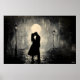 Uma obra de arte romântica em preto e branco que retrata um casal se abraçando sob a luz do luar em uma rua tranquila e molhada pela chuva. Esta cena minimalista e cinematográfica captura intimidade, silêncio e conexão emocional, tornando-a ideal para interiores elegantes e decoração de parede romântica atemporal.