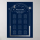 Mystical Blue Silver Sun Moon Stars Astronomy Wedding Seating Chart Sign Instant Download Digital Printable Poster Impressões apresenta um sol prateado, lua e estrelas armadas em um fundo azul. Dentro, o quadro é o texto "Bem-vindo" em um roteiro elegante de caligrafia prateada e suas informações personalizadas de assentos de casamento. Projetado por ©2022 Evco Studio www.zazzle.com/store/evcostudio
