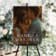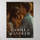 Uma camada moderna com grandes nomes e uma foto de sangria de cheio são as características desta placa de casamento.