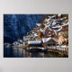 Poster impressão das fachadas das casas de madeira ao lado do lago de Hallstätter Ver lago sob uma camada de neve fresca no inverno em Hallstatt, Áustria.