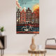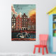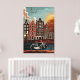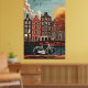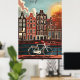 Uma ilustração de Amsterdã, a capital dos Países Baixos, apresenta casas charmosas e coloridas ao longo de um canal, uma bicicleta branca no primeiro plano e árvores de outono sob um céu azul com pássaros voando.