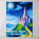 Cartaz em um castelo em um morro com uma estrada que vai até o portão, e um céu noturno com lua cheia e estrelas. O texto lembra que você "segue seus sonhos".