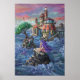 Se você ama as sereias, então esta pintura é para você. O Castelo de Sereia pintado por Traci Van Wagoner apresenta uma sereia com cabelo roxo na frente e uma sereia com cabelo verde se soltando em ilhas rock enquanto outra sereia com natações de cabelo cor-de-rosa no oceano diante de um castelo com um céu roxo, laranja e amarelo por trás. Esta bela e caprichosa arte da fantasia faz um presente de excelente e uma decoração espantosa para o seu escritório ou casa.