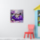 A wall art with a sweet kitty cat sitting on a ball of purple yarn and next to a purple vase of flowers.