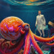 "Cativeiro Silencioso do Oceano" - Retrato Colorido de Octopus. Num mundo oceânico surreal, um polvo gigante assiste um homem solitário preso dentro a vidro. Esta cena evocativa explora temas do confinamento, a vastidão da natureza e a frágil barreira entre liberdade e cativeiro. As cores vibrantes e os detalhes intrincados convidam uma profunda reflexão sobre a vulnerabilidade humana sob as ondas.