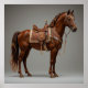 Cavalo Marrom Elegante Decorado com Sela e Brida Intrincados em um Estúdio, Adornado com sela e brida projetadas de forma intrincada, mostrando detalhes luxuosos e habilidade artesanal. Posado perfeitamente em um estúdio, destacando a elegância equestre e a arte refinada.