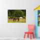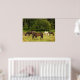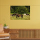 Este poster apresenta cavalos castanhos e brancos pastoreando na grama alta de um campo de ouro em um dia quente de verão.