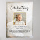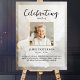 O pôster de memorial perfeito para cumprimentar familiares e amigos ao entrarem na celebração da vida de seu ente querido. O design apresenta uma foto pessoal quadrada, 5 linhas de texto personalizado e uma foto de fundo de uma bela pomba branca. Você pode facilmente trocá-la por sua própria foto de fundo. Clássico, porém único - este modelo é muito fácil de personalizar e também será uma lembrança maravilhosa do memorial.
