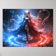 Uma bruxa com cabelos prateados que fluem controla o fogo e a geada brilhante, seu traje de ornamentado refletindo seu poder. As vibrantes matizes de dança mágica ao seu redor enquanto ela comanda as forças da natureza num abismo estrelado.