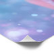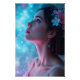 Retrato dramático e muito detalhado de uma mulher olhando nitidamente para cima em direção aos céus cósmicos. Seu rosto é quase cheio, com um olho subtilmente visível. A luz celeste intensa em ciano brilhante e magenta profunda ilumina seus traços e espumantes ornamentos florais. Dinâmico, etéreo e visualmente impressionante.