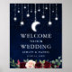 Poster de boas-vindas do Casamento Celestial. Céu azul de água com estrelas e a lua. Luzes de cordas. Aquarela Borgonha Azul Cor-de-rosa azul. Greenery Eucalyptus Sai.