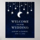 Poster de boas-vindas do Casamento Celestial. Céu azul de água com estrelas e a lua. Luzes de cordas.