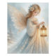 A serene winter angel stands in a gentle snowfall, holding a softly glowing lantern that casts warm light across a peaceful forest scene. Her delicate wings, embroidered gown, and hand placed tenderly over her heart evoke a feeling of comfort, hope, and quiet blessing. Soft blues, warm golds, and subtle winter florals blend together to create a dreamlike seasonal moment filled with emotion and grace. The angel’s contemplative pose and the lantern’s radiance offer a sense of guidance, stillness, and spiritual warmth, making this design ideal for winter décor, thoughtful holiday imagery, and meaningful keepsakes. AI generated artwork.