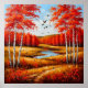 Cena outonal da zona rural com folhagem vermelha e laranja vibrante, um lago tranquilo e aves voando alto, evocando sentimentos de serenidade e beleza natural na vibrante estação do outono.