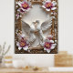 Um par de pombas brancas graciosas cercadas por um trabalho de arte floral detalhado e um enquadramento de ouro ornamentado, incorporando amor, paz e elegância.