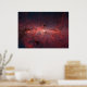 Esta impressionante imagem infravermelha do Telescópio Espacial Spitzer da NASA mostra centenas de milhares de estrelas amontoadas no núcleo giratório da nossa galáxia espiral da Via Látea. Em imagens à luz visível, esta região não pode ser vista de todo porque poeira que se encontra entre a Terra e o centro galáctico bloqueia a nossa visão. Nesta imagem de cor falsa, estrelas velhas e legal são azuis, enquanto as poeiras são iluminadas por estrelas quentes e maciças são mostradas numa matiz avermelhada. Tanto as nuvens filamentosas brilhantes como escuras podem ser vistas, muitas das quais abrigam berçários estelares. O plano do disco plano da Via Látea é a principal banda horizontal de nuvens. A mancha branca mais brilhante do meio é o centro da galáxia, que também marca o local de um buraco negro supermassivo. A região aqui ilustrada é imensa, com uma extensão horizontal de 890 anos-luz e uma envergadura vertical de 640 anos-luz. A Terra fica a 26 mil anos-luz de distância, num dos braços espirais da Via Látea. Embora a maioria dos objetos vistos nessa imagem esteja localizada no centro galáctico, as características acima e abaixo do plano galáctico tendem a se situar mais perto da Terra. Os cientistas estão intrigados pelos lóbulos gigantes da poeira se afastando do plano da galáxia. Eles acreditam que os lóbulos podem ter sido formados por ventos de estrelas massivas. Essa imagem é um mosaico de milhares de exposições curtas tiradas pela câmera infravermelha de raios infravermelhos (IRAC) do Spitzer, mostrando emissões de comprimentos de onda de 3,6 mícrons (azul), 4,5 mícrons (verde), 5,8 mícrons (laranja) e 8,0 mícrons (vermelho). Toda a região foi avaliada em menos de 16 horas.