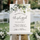 O Elegante design botânico apresenta "bem-vindo à nossa cerimônia desconectada" em caligrafia manuscrita e letras de blocos com seus nomes e mensagem personalizada abaixo. Mostrado com "por favor guarde seus telefones e câmeras até depois da cerimônia." Adorados com bordas de cor aquosa verde e flores brancas empoeiradas que combinam com a nossa coleção de casamentos verde Dusty White Roses.