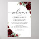 Projetado para coordenar com a nossa coleção de casamento Rustic Blooms, este modelo personalizável signo de cerimônia desplugado apresenta uma lenha de cor d'água e flores vermelhas com folhas verdes e foi emparelhado com uma elegante caligrafia e uma letra de serifa clássica em preto. Para fazer alterações avançadas, selecione a opção "Editar usando a Ferramenta de Design" em Personalizar este modelo.