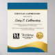 Certificado universal de excelência ou apreciação com design de onda moderna em esquema de cor azul e dourado, selo de ouro falso ou emblema; basta adicionar seu texto, logotipo e carregar uma assinatura ou apagar e escrever em seguida.