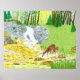 Um pôster com uma bela cena florestal incluindo cerva e filhote bebendo de um riacho perto de uma cachoeira. Arte original de W.B.
