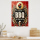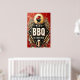 Um design gráfico com uma grelha, cerveja, pedúnculos de trigo, asas e estrelas. O texto Beer CHURRASCO Go Together é exibido em uma fonte em negrito.