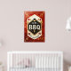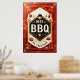 Uma ilustração de uma grelha estilizada de CHURRASCO com as palavras Cerveja e CHURRASCO Ir Juntos. O design apresenta um esquema de cores vermelho e dourado com sotaques decorativos.