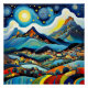A.I. criou impressão de um céu estrelado celeste surreal brilha sobre montanhas e prédios de cidades nidificando dentro da paisagem abaixo.