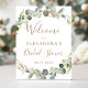 Sinais de Boas-Vindas para Casamento em Aquarela com Folhagens Botânicas de Eucalipto e Folha Dourada Falsa - inclui uma tipografia elegante e moderna com flores botânicas tropicais e folhagens para a celebração especial do casamento na primavera ou verão.