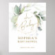 Poster de Sinal de Boas-vindas do Chá de fraldas Este belo design apresenta folhas de eucalipto e tipografia de ouro. Faça uma festa perfeita com o símbolo de boas-vindas do Chá de fraldas Oh Baby Eucalyptus. Personalize com suas informações ou clique em "Clique para personalizar mais" para editar estilos de fonte, tamanho e cores.