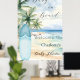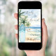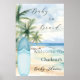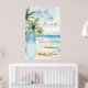 Um sinal de boas-vindas para um Chá de fraldas, celebrando um menino. Uma praia arenosa de cor aquática, ondas oceânicas e palmeiras como fundo, e uma prancha azul na praia.