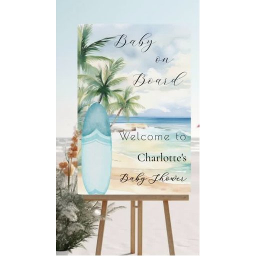 Um sinal de boas-vindas para um Chá de fraldas, celebrando um menino. Uma praia arenosa de cor aquática, ondas oceânicas e palmeiras como fundo, e uma prancha azul na praia.