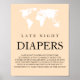 Você está hospedando um chá de fraldas temático de viagem? Se a sua resposta é sim, então é para si! Sinal bonito de "fralda noturna tardia" que corresponde ao tema do chá de fraldas. Confira o resto da coleção para fazer correspondência com convites de passaporte, decoração por viagem e jogos de chá de fraldas. Temos 7 cores pastéis: azul, rosa, roxo, verde, amarelo, laranja e bege. Você encontrará um par perfeito para uma menina, um garoto ou um chá de fraldas neutro em gênero.