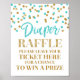 Sinal de rifa de fralda para chá de fraldas em padrão de confete azul claro e dourado. Observe que o efeito de brilho é apenas efeito fotográfico.