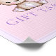 Para a mesa do presente no seu chá de fraldas. Garota linda, roxa e urso marrom em cobertor rosa e roxo bebê com ela. Texto "Mesa do presente".