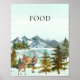 Para a mesa da Comida no seu chá de fraldas. Este design tem montanhas rústicas e aquáticas com lago refletor na frente, e pinheiros ao redor do lago. Veado adulto com a cara na frente. Texto de "Comida" no topo.
