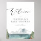 Este sinal de boas-vindas do chá de fraldas apresenta uma cena de lago de montanha de aquarela com pinheiros e uma letra elegante de script. Altere facilmente a formulação *maioria* para atender às suas necessidades de eventos.