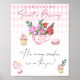 "Algo Doce está se preparando". Chá de fraldas temático da festa do chá de água. Uma xícara de água de chá, macarões, cupcakes e flores. Rhomb rosa.