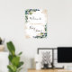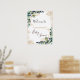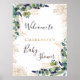 Bem-vindo a um Chá de fraldas elegante. Um fundo branco chic. Decorados com folhas de eucalipto, prigos, verde, folhas de ouro falso e manchas ouro de cor aquosa. Personalize e adicione o nome da mãe. Letras pretas e ouros.