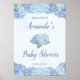 Este poster chá de fraldas apresenta flores azuis de hydrangea. Personalize-o com um nome e uma data. Este poster faz parte de uma coleção que apresenta uma faixa de cheios de produtos de chá de fraldas correspondentes.